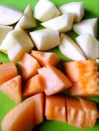 1. 将苹果和哈密瓜洗净,去皮去籽,切成小块。
